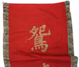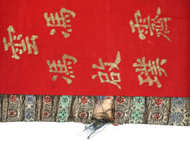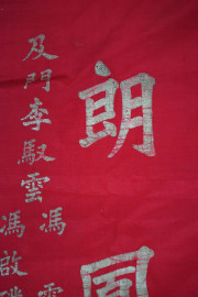 Antico tessuto cinese in seta a fondo rosso con monogrammi, lunghezza cm 223x42, (difetti).