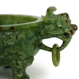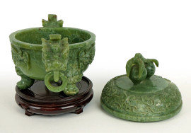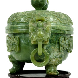 Bruciaprofumo in giada, intagliato a bassorilievo con motivi vegetali, prese a teste di dragoni, cm h 22x29, base in legno, Cina, XX secolo, (segni del tempo).