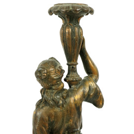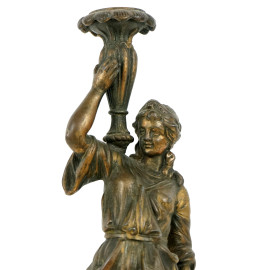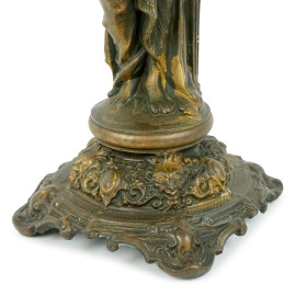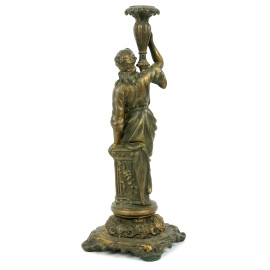 Candeliere in antimonio con fusto raffigurante figura femminile, cm h 38, XX secolo, (segni del tempo).
