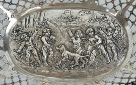 Cestino in argento traforato, di forma ovale, cavetto decorato a sbalzo con putti, cm 5x28,5x23,5, inizi XX secolo, peso gr 356