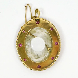 Ciondolo in porcellana dipinta raffigurante gentildonna con montatura in oro 18 kt, cm h 3,7, peso totale gr. 12