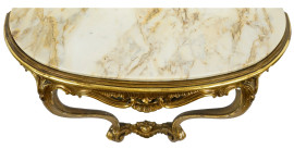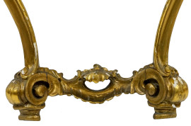 Consolle a mezzaluna in legno dorato ed intagliato, XX secolo, piano in marmo, due gambe mosse desinenti a ricciolo, cm h 64,5x87,5x31, (difetti).