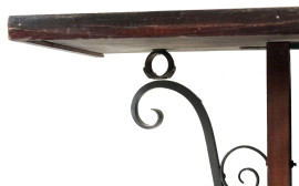 Consolle in noce, XX secolo, piano di linea rettangolare, montante con applicazioni a ricciolo in ferro battuto, poggiante su pianetto, cm h 79x71,5x30,5, (difetti).