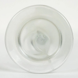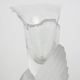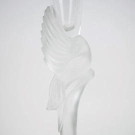 Coppia di candelieri in cristallo Fabergè, fusti satinati a forma di colombe, cm h 22,5, seconda metà XX secolo, (di cui uno rotto)