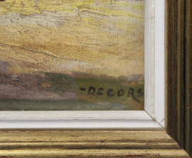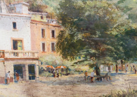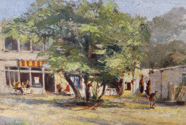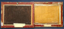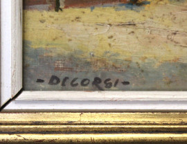 Coppia di dipinti raffiguranti esterni con figure, oli su tavola, cm 22 x 30, firmati, entro cornici.