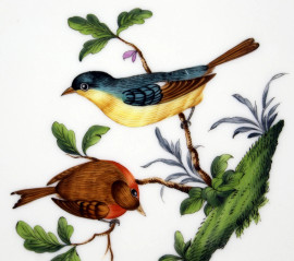Coppia di piatti grandi in porcellana Herend, XX secolo, decori policromi raffiguranti volatili, diam. cm 21,