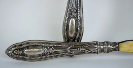 Coppia di posate da insalata con manici in argento cesellato e sbalzato, inizi XX secolo