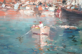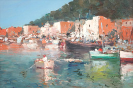 Costa con imbarcazioni, olio su tavola, cm 22x28, XX secolo, entro cornice