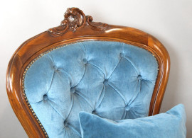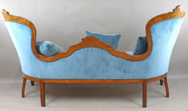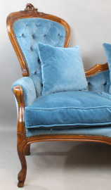 Divano in stile Luigi Filippo, struttura in noce, schienale sagomato capitonné, rivestito in velluto blu, altezza cm. 110x190x75 circa