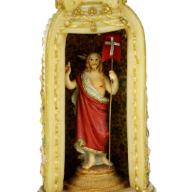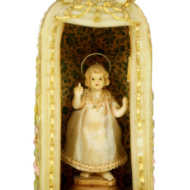 Due sculture raffiguranti Cristo e il Bambinello entro nicchie modellate in cera, decori ed applicazioni policrome, finiture dorate, cm h 16,5, inizi XX secolo, (difetti).