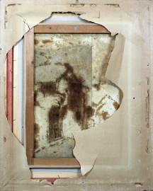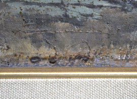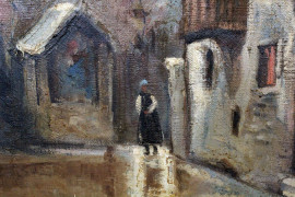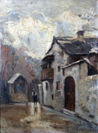 Esterno di casale con figura, olio su tela, cm 75x55, XX secolo, entro cornice.