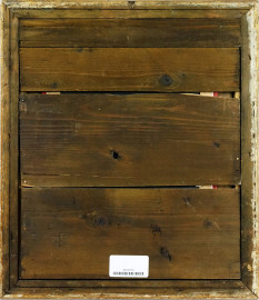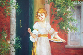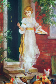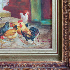 Fanciulla con galline, olio su tavola, cm 24x19, firmato, entro cornice
