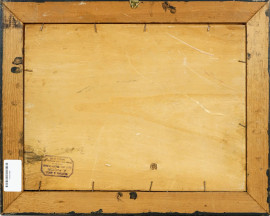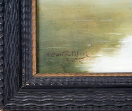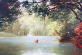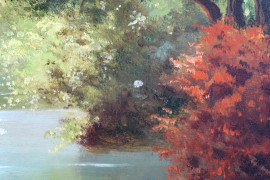 Fiume con barca e figura, olio su tavola, cm 30x40, firmato, entro cornice.