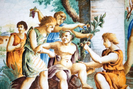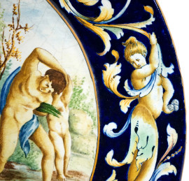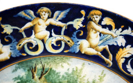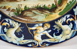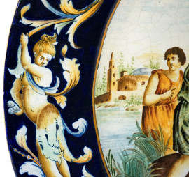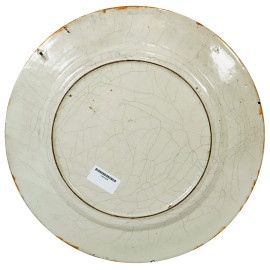 Grande piatto in maiolica policroma dipinta e smaltata, cavetto raffigurante paesaggio con Allegoria della vendemmia, tesa con decoro a raffaellesche su sfondo blu, diam. cm 49, fine XIX secolo, (segni del tempo).