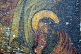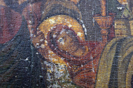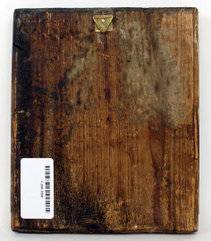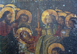 Icona raffigurante Dormitio Verginis, olio su tavola, cm 21,5x18, inizi XX secolo, (difetti e cadute di colore).