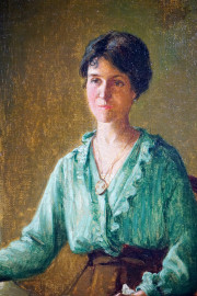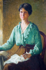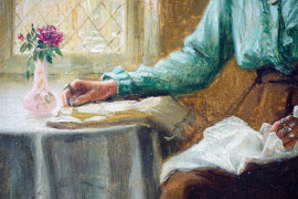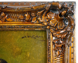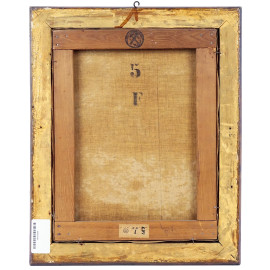 Interno con donna assorta, olio su tela, cm 35x27, firmato, entro cornice.