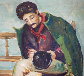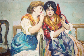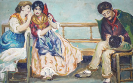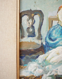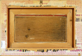 Interno con figure, olio su tavola, cm 19,5x40, entro cornice