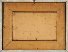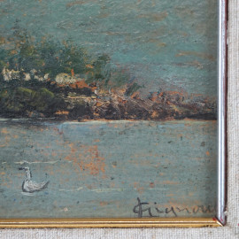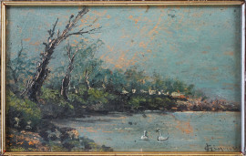 Lago con cigni, olio su cartone, cm 14,5,x23, firmato, entro cornice.