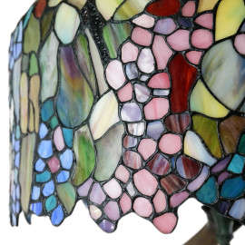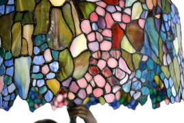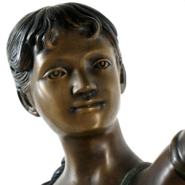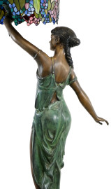 Lampada da terra con paralume in vetro piombato policromo sorretto da scultura di fanciulla in bronzo brunito, cm h 155, base in marmo cm h 31x40x40, XX secolo, (lievi difetti).