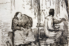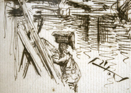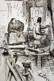 Lo studio del pittore, china su carta, cm 13x8,5, firmato, entro cornice.