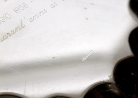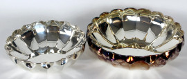 Lotto di due centrini di linea tonda, in metallo argentato, bordo smerlato, altezza max cm. 7, diametro cm. 26