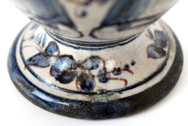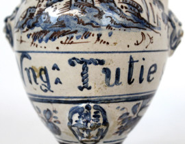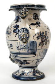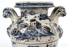 Lotto di due oggetti in ceramica, composto da un vasetto da elettuario con prese a foggia di protomi animali su mascheroni ed un cofanetto con coperchio dipinto a motivi floreali blu, manifatture ed epoche diverse, misure max cm h 7x18,3, (piccoli difetti).
