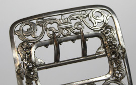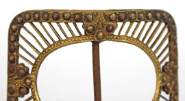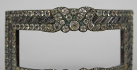 Lotto di sette fibbie in metallo dorato ed argentato con strass e dettagli floreali, misure max cm 8,5, (difetti e mancanze).