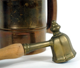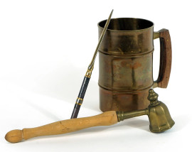 Lotto di tre oggetti diversi, composto da un boccale, un tagliacarte marcato Delta ed uno spegnicandele, alt. max cm 22,5, XX secolo, (segni del tempo).