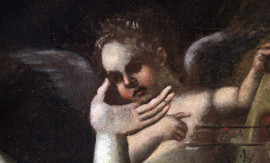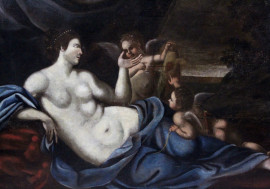 Maniera di Francesco Albani (Bologna 1578-Bologna 1660), Venere e amorini con arco e frecce, olio su tela, cm 102x130, entro cornice
