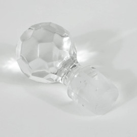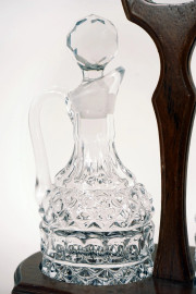 Oliera ed acetiera in cristallo controtagliato, con supporto in legno, cm h 26x21x12, XX secolo.