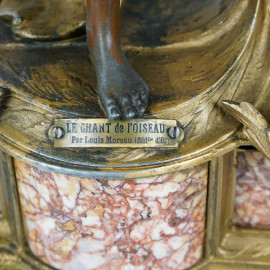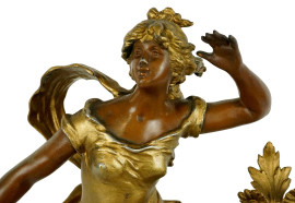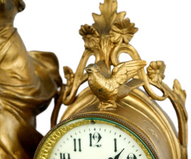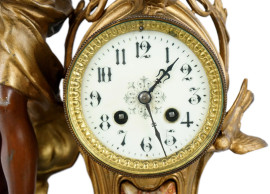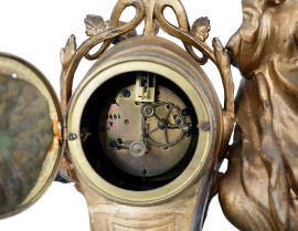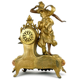 Orologio da tavolo in antimonio sormontato da figura femminile, quadrante a numeri arabi, particolari in marmo, cm h 57x44x14, inizi XX secolo, (segni del tempo, meccanismo da revisionare).