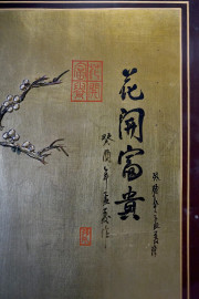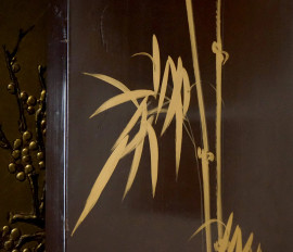 Paravento orientale in legno laccato con decori dorati raffiguranti volatili, XX secolo, cm h 183,5x162 (con panelli aperti)