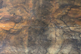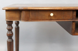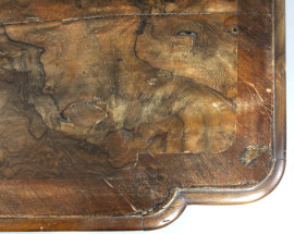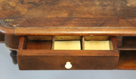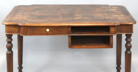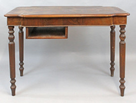 Piccolo scrittoio in noce e radica di noce, fine XIX secolo, piano sagomato, gambe tornite, cm h 67x93x56, (difetti, cassetti mancanti)