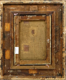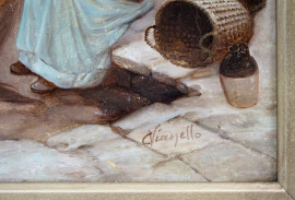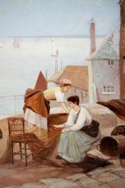 Riparatrici di reti da pesca, olio su tela, cm 41x31, firmato, entro cornice.
