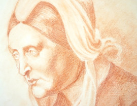 Ritratto di popolana, sanguigna su carta, cm 19x17, XX secolo, entro cornice.