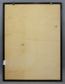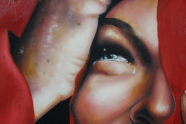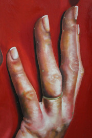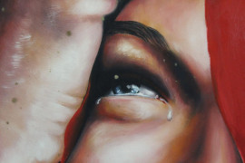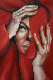 Volto di donna con velo rosso, acrilico su cartone pressato, cm 100x75, firmato in basso a sinistra, (macchie diffuse)