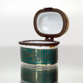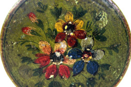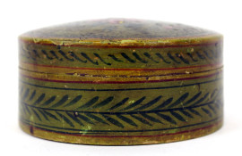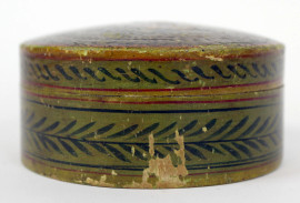 Scatolina in legno dipinto a motivi floreali, cm h 4,5, diam. cm 9,5, (segni del tempo).
