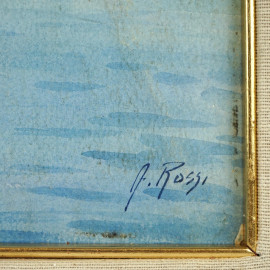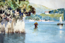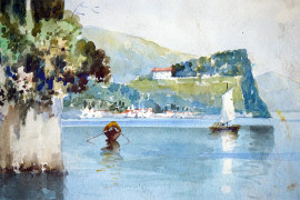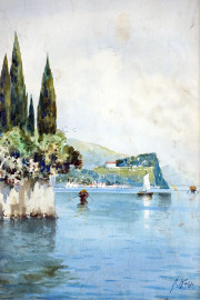 Scorcio di lago, acquarello su carta, cm 34x24, firmato, entro cornice.