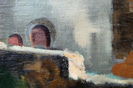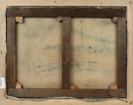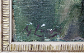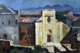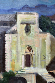Scorcio di paese con chiesa, olio su tela, cm 48x64, firmato, entro cornice.