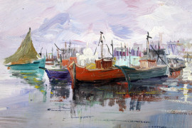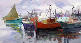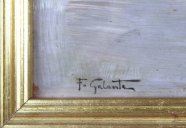 Scorcio di porticciolo con imbarcazioni, olio su tavola, cm. 18x24, firmato F. Galante, entro cornice.