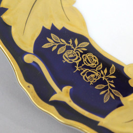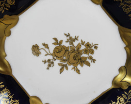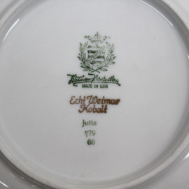 Servizio da dolce in porcellana, composto da sei piattini ed un centrotavola, tesa con decoro blu cobalto e motivi floreali dorati, diam. max cm 25, marcato Weimar alla base, (lievi difetti).
