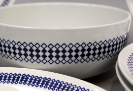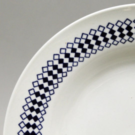 Composto da: dodici piattini piani, dodici piatti fondi, un'insalatiera ed una salsiera, tesa con decoro a motivo geometrico blu.