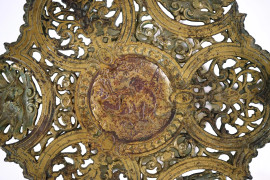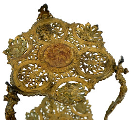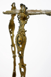 Tavolino portavaso in metallo dorato, XX secolo, a due ripiani, decoro raffigurante coppie di putti musicanti e motivi vegetali, poggiante su tre gambe mosse, cm h 76, (segni del tempo).