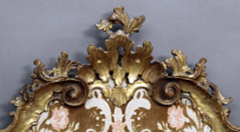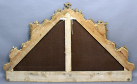 Testata da letto in legno dorato ed intagliato a volute e foglie d'acanto, tappezzeria in stoffa fiorata, XIX sec, h. 112x186 cm.