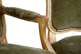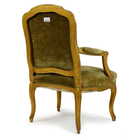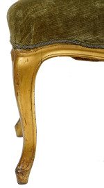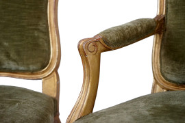 Tre poltrone in legno dorato, XIX secolo, imbottite e rivestite in velluto verde, cm h 91,5, (piccoli difetti).