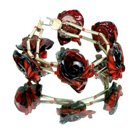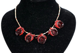 Una collana ed un bracciale con rose in vetro bordeaux ed altre applicazioni, lunghezza max cm 22, (segni di utilizzo).