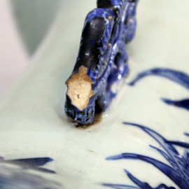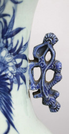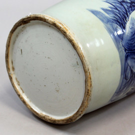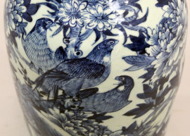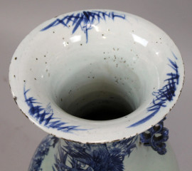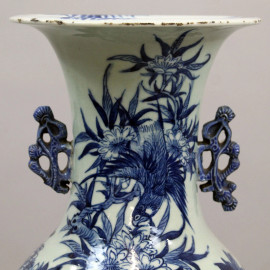 Vaso in porcellana blu, Cina, XIX secolo, decoro a motivo di paesaggi con volatili, due prese laterali traforate, cm h 59,5, (difetti).