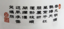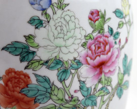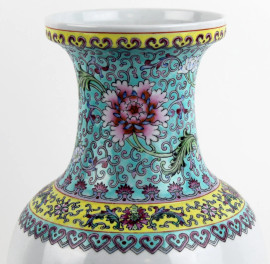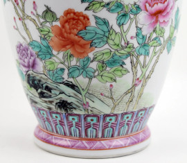 Vaso in porcellana dipinta in policromia a motivi floreali ed iscrizioni, altezza cm. 35,5, Cina, XX secolo.