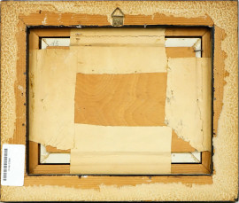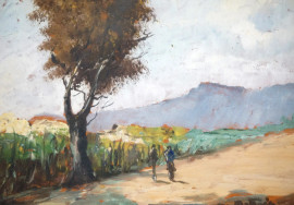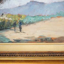 Viale con albero e figure, olio su tavola, cm 14,5x21, firmato, entro cornice.