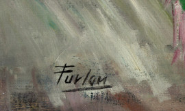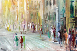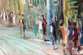 Viale con figure, olio su tela, cm 38x34, firmato, (mancante telaio).